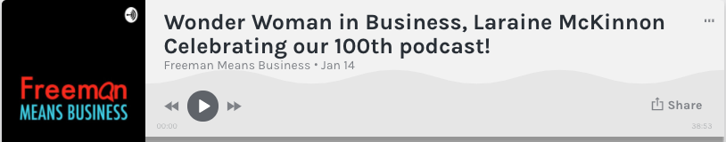Podcast: Wonder Woman in Business, Laraine McKinnon Celebrating our 100th podcast! January 15, 2020May 13, 2020 Podcast: https://anchor.fm/freeman-means-business/episodes/Wonder-Woman-in-Business–Laraine-McKinnon-Celebrating-our-100th-podcast-ea6c80/a-a9kmn4 Blogcast: https://freemanmeansbusiness.com/blog/2020/1/13/wonder-woman-in-business-laraine-mckinnon-celebrating-our-100th-podcast Share this: Click to share on X (Opens in new window) X Click to share on Facebook (Opens in new window) Facebook Like Loading... Related