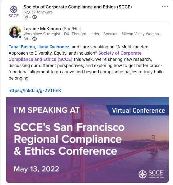 Event: A multi-faceted approach to diversity, equity, and inclusion May 13, 2022 Society of Corporate Compliance and Ethics (SCCE) San Francisco Regional Compliance & Ethics Conference Share this: Click to share on X (Opens in new window) X Click to share on Facebook (Opens in new window) Facebook Like Loading... Related